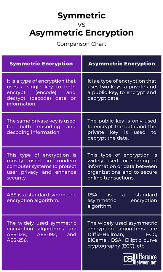 The basic difference between these two types of encryption is that symmetric encryption uses one key for both encryption and decryption, and the asymmetric encryption uses public key for encryption and a private key for decryption.