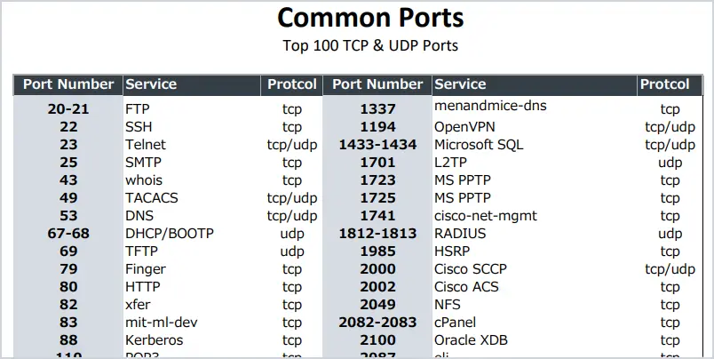 - ICMP (Internet Control Message Protocol) – Port N/A (Protocol)